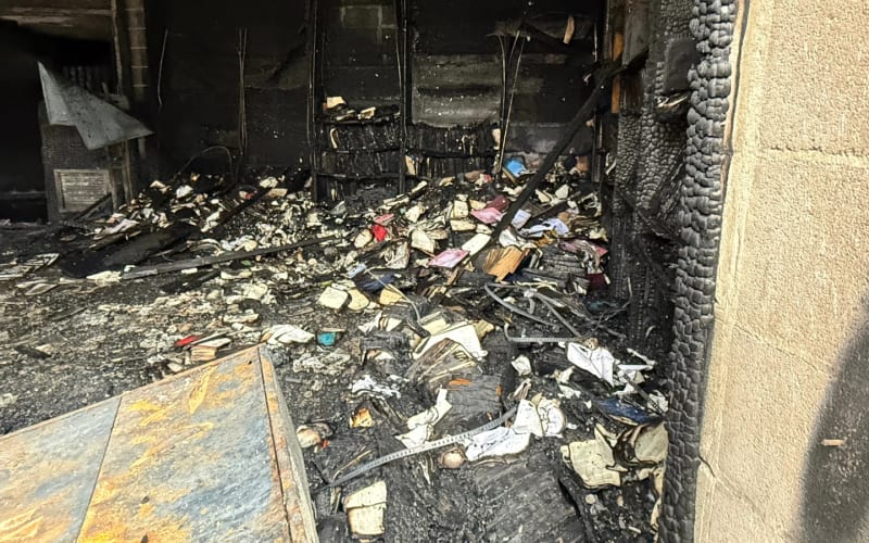 The fire broke out around 3 a.m. Security cameras showed a person pouring gasoline and lighting a fire. The fire caused extensive damage to the synagogue's library. Several Torah scrolls were burned, but some of the older scrolls were saved from the flames.